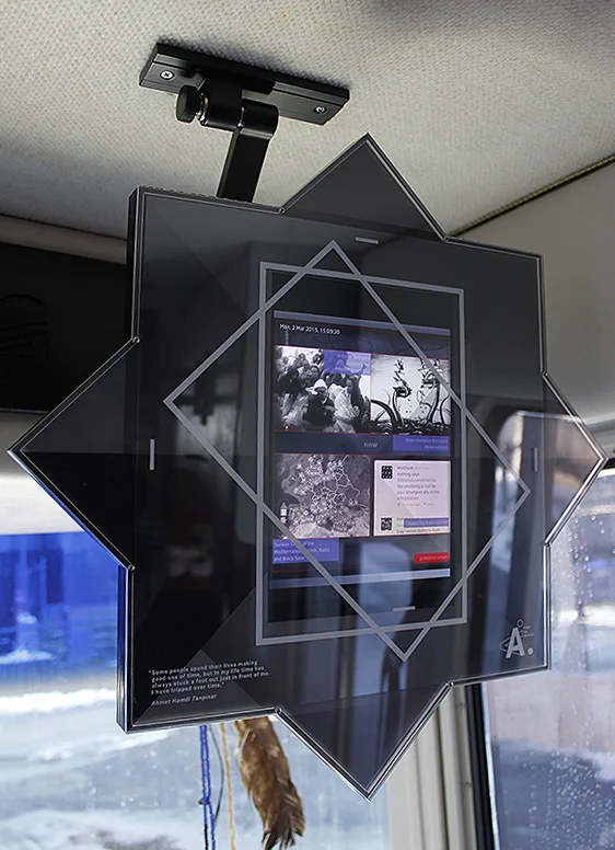 The Emancipati Ensemble (2013) is an installation that features readers that address the needs of a more discursive religious pedagogy. These readers connect with each other and form “reading ensembles” among two to four children. The screens of the tablets make a shared reading surface and let children read, watch, and learn together. The dual-tablet interface presents information with alternative points of view by using custom content analysis software. Children get exposed to perspectives from multiple points of view that span across different religions, belief systems, orthodox, secular, scientific or agnostic opinions at the same time. Thus, children not only can introduce their own preferences and styles of learning by picking from a multitude of sources but also share with each other what they individually encounter during their studies.